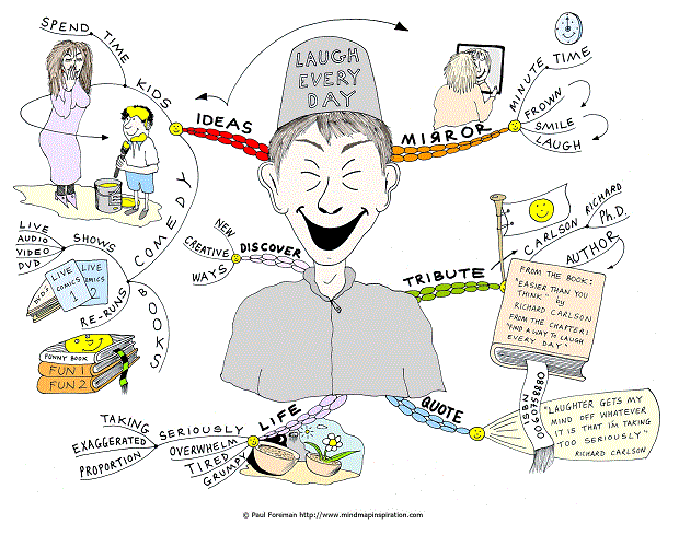 这个思维导图是一个叫 Richard Carlson(李察) 的人给我们留下的许多关于改变人生幸福书籍的思维导图,通过改变自己来减小压力。在他的书“比你想象的容易”中,其中一章叫做“寻找一种每天欢笑的方法”。 李察讲述了一天,他认真对待的每件事,似乎整个世界都对他很不利,他感到不知所措,疲倦和脾气暴躁。他的心态意味着一切都变得如此的糟糕且不成比例。 李察的妻子克里斯(你可以在推特@ KristineCarlson跟着她)有个完美的解决方案。当他们坐在停车场的车里时,她说:“李察,如果你能在镜子里看着自己整整一分钟,而不是笑出声来,我就给你五美元。” 这听起来似乎很简单,但五秒钟后,一张皱皱的脸变成了微笑,笑容又变成了笑声,笑声又变成了幸福的泪水。 李察建议我们要在笑声中看到价值,而不是把它视为无聊或忽视这个好时机。照镜子是一种方法,你可以想出许多其他创造性的方法去看轻不利的一面。 李察认为,这样的例子,就如和孩子们在一起的时光 ,阅读有趣的书或看最喜欢的喜剧节目。他说:“不管我多么认真地对待,笑都能使我的头脑清醒。” 这是本章节选: “笑的行为是一个强大的复位按钮,恢复了人的大局观。”。笑是我们的思维方式,它告诉我们一切都会好起来的。当我们笑的时候,我们的身体会释放出叫做内啡肽的分子,立刻使我们开始感觉好了一些。简单地说,笑是最容易也是最自然的方式,它使我们立即拥有好的感觉。 下一次你有一个坏心情的时候,试着用由 Richard Carlson 提出的“每天笑一笑”的方式释放您的笑声。 我在此推荐这本书 Richard Carlson 的“比你想象的要容易”,通过思维导图图解我的微笑——希望它也能让您微笑起来!