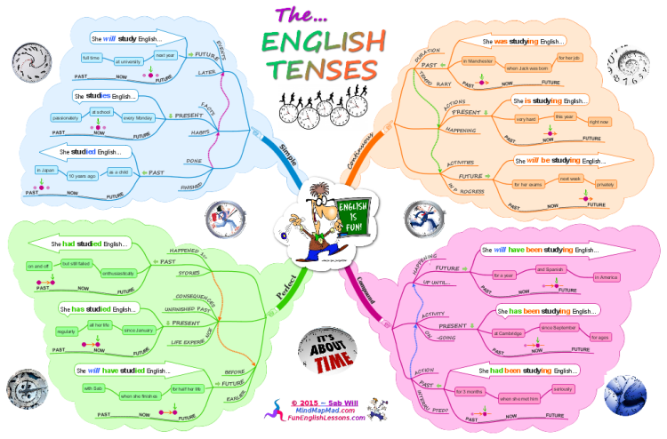 这种颜色编码的英语教学和参考思维导图以清晰、吸引人的格式展示了主要的英语动词时态。 如果你对英语动词时态思维导图感兴趣,我真的建议你阅读。 如果你这样做的话会更加清楚,而且你会更加了解这个时态的变化是怎样进行的。 我所涵盖的动词时态是: 过去进行时/现在进行时/将来进行时 过去完成简单/现在完成简单/未来完成简单 过去完成进行时/现在完成进行时/未来完成进行时 一个简单的例子(她学习英语)在所有时态中都是成对的,一些典型的句子结尾给出了更多的上下文。 我还指出了每个时态(习惯,未完成的过去等)的一些典型特征,并提供了一个时间线图,以帮助进一步理解。剩下的就看你了!