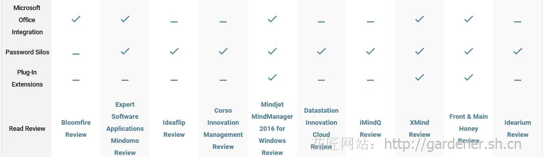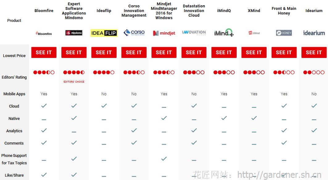 我们测试和比较了10个思维导图软件解决方案,让您的员工分享他们的想法,管理思想过程,并提供一个结构化的软件工作空间,从最初的想法一直到完成的项目。现测试结果如下: 精选思维导图软件评论 (2017最佳思维导图软件) 花匠网站国内独家翻译转发 花匠言:作为经典的思维导图,评测中没有把 iMindmap 和 Mindmapper 放入其中,觉得有点意外。故请各位仅做参考。 我们测试和比较了10个思维导图软件解决方案,让您的员工分享他们的想法,管理思想过程,并提供一个结构化的软件工作空间,从最初的想法一直到完成的项目。现测试结果如下: 1、Bloomfire 建议零售价: $9.00 思维导图软件解决方案对于需要性能分析的以视觉为中心的团队来说,Bloomfire是一个不错的选择。 2、Mindomo 建议零售价: $36.00 思维导图软件解决方案专家软件应用Mindomo是其评论功能的编辑选择奖得主,它加强了其社交威力和思维导图能力。 3、Ideaflip 建议零售价: $16.00 Ideaflip是一个伟大的思维导图工具,用于捕捉想法和构建思维导图,但缺乏一些团队可能需要的分析工具。 4、Corso Innovation Management 建议零售价: $3.00 Corso创新管理思维导图软件提供了管理所有业务流程(包括创意)的功能,但这并不是最容易使用的。 5、Mindjet MindManager 2016 for Windows 建议零售价: $349.00 思维导图软件解决方案Mindjet MindManager 2016 for Windows是一个坚实的理念管理和思维导图执行者。 6、Datastation Innovation Cloud 建议零售价: $28.39 数据化创新云简化了从员工收集想法的过程,但是如果您正在寻找思维导图软件,则必须到别处去看看。 7、iMindQ 建议零售价: $9.19 iMindQ易于使用,包括许多伟大的头脑风暴工具,但其协作功能是有限的。 8、XMind 建议零售价: $79.00 理念管理软件解决方案,如果您的IT团队可以根据需要调整XMind,XMind是一个比较好的思维导图应用程序。 9、Front & Main Honey 建议零售价: $4.00 Idea管理软件解决方案,Front&Main Honey是面向中小型企业(SMB)和希望进入门槛低的组织的有用服务。 10、Idearium 建议零售价: $214.64 idearium是具有多种可供选择计划,比较适宜的产品,但它是相当昂贵的,尤其是考虑到公司尝试接触反应迟钝的。