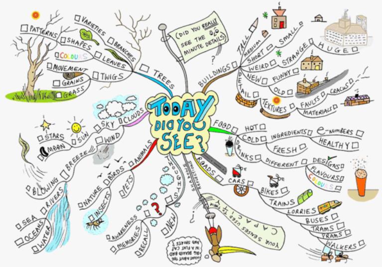 这个思维导图结合起来作为一个清单,让你反思你的一天。我创造它是为了帮助提高当下的意识。当我们度过一天的时候,影响我们感官和头脑的事物的数量是难以置信的。我们到底能看到多少? 你的观察能力如何?试着在一天结束时检查清单,回顾你记得看到的项目。你可以走得更远,比如你看到一堵砖墙,你看到颜色、阴影、裂缝和瑕疵、昆虫等等了吗? 如果你是从一个罐子或瓶子里喝水的,那么你在约会前是否看到了最好的东西,标签上的小印子,瓶子下面的印记,打开盖子的小塑料片,拉环和说明,配料,大小,形状,液体含量,食用建议,消费建议。你看到它是在哪里制造的,矿物成分,标志和文字的设计和颜色,产品名称和装运时间了吗?你注意到重量了吗?当你喝这种液体的时候,你感觉到了它的味道,它的温度是平的还是冒泡的;它是清爽的吗?仔细看——可能会有更多。 你可以试着在一天结束时创建一个思维导图;回忆所有发生的事情和你所看到的。这是一个精彩的观察和回忆练习。试着做一个星期,你会发现你的观察力得到了提高,你的思维导图很可能在周末包含更多的内容,因为你会在晚上创建思维导图之前的一天中提高你的观察能力。 在我们的大脑和我们自己的思维之外,世界充满了信息、奇迹和学习——今天,你看到了什么?
