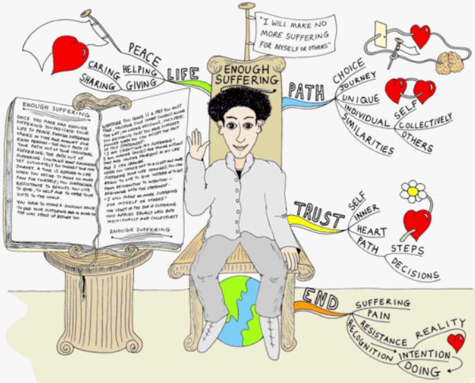 一旦你遭受了足够的痛苦,你就将你的一生奉献给和平。对每个人来说,“足够的痛苦”在类型和数量上各不相同——唯一的途径就是走出你个人的痛苦。走出苦难的道路有许多相似之处,但最终你还是要走自己的路。 当你决定不再为自己制造痛苦时,生活就已经到了一个时刻;你放弃了对现实的抵抗。你活着是为了给予、帮助和向世界奉献你的礼物。 你必须做出一个有意识的选择来结束你的痛苦,这样做的方式就会在你面前打开。 无论你选择什么,都是你必须采取的一个步骤,一路上要相信你内心的罗盘;没有错误的决定,只有步骤。 当你接受这一陈述的事实时,你意识到你已经受够了: “我在制造我的痛苦” 我正在做出选择,并采取行动,这会给我的生活带来问题,我可以改变。 当你选择不再接受任何痛苦的时候,你的生活就会改变。你可以开始活在给予而不是得到。 从承认到意图——从陈述开始: “我不会再为自己或他人受苦了” 痛苦结束的开始。 这同样适用于个人和集体。