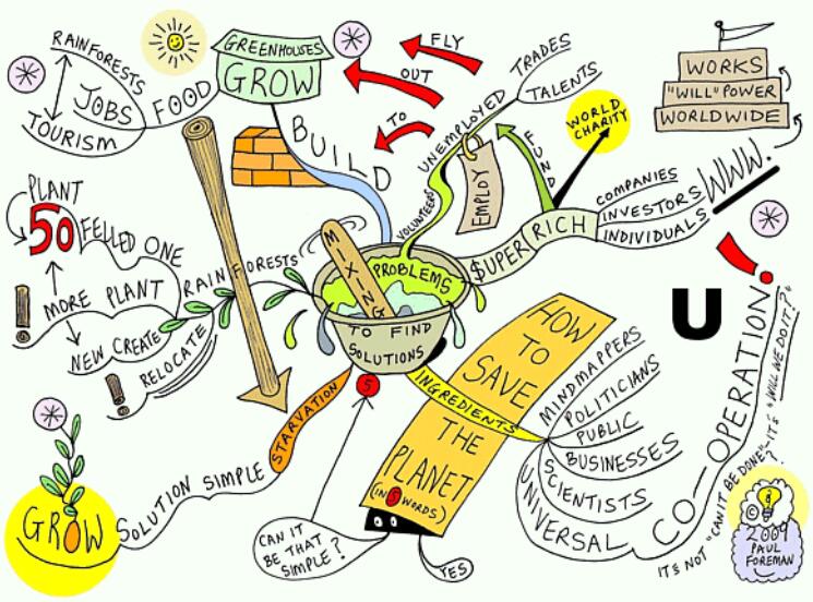 它开辟了寻找解决方案的新途径,并强调大多数解决方案都很简单。这是一个思维导图,几乎没有触及表面,但原则是这样简单。找到简单的答案。然后是一个如何进行的问题,思维导图也可以揭示这一点。以饥饿为例显然答案是食物。在这个科技时代,种植粮食应该有那么困难吗?我们应该可以在任何地方种植食物!即使需要建造温室和水库。只有当你把注意力放在问题上而不是解决方案上时,进展才会受阻。