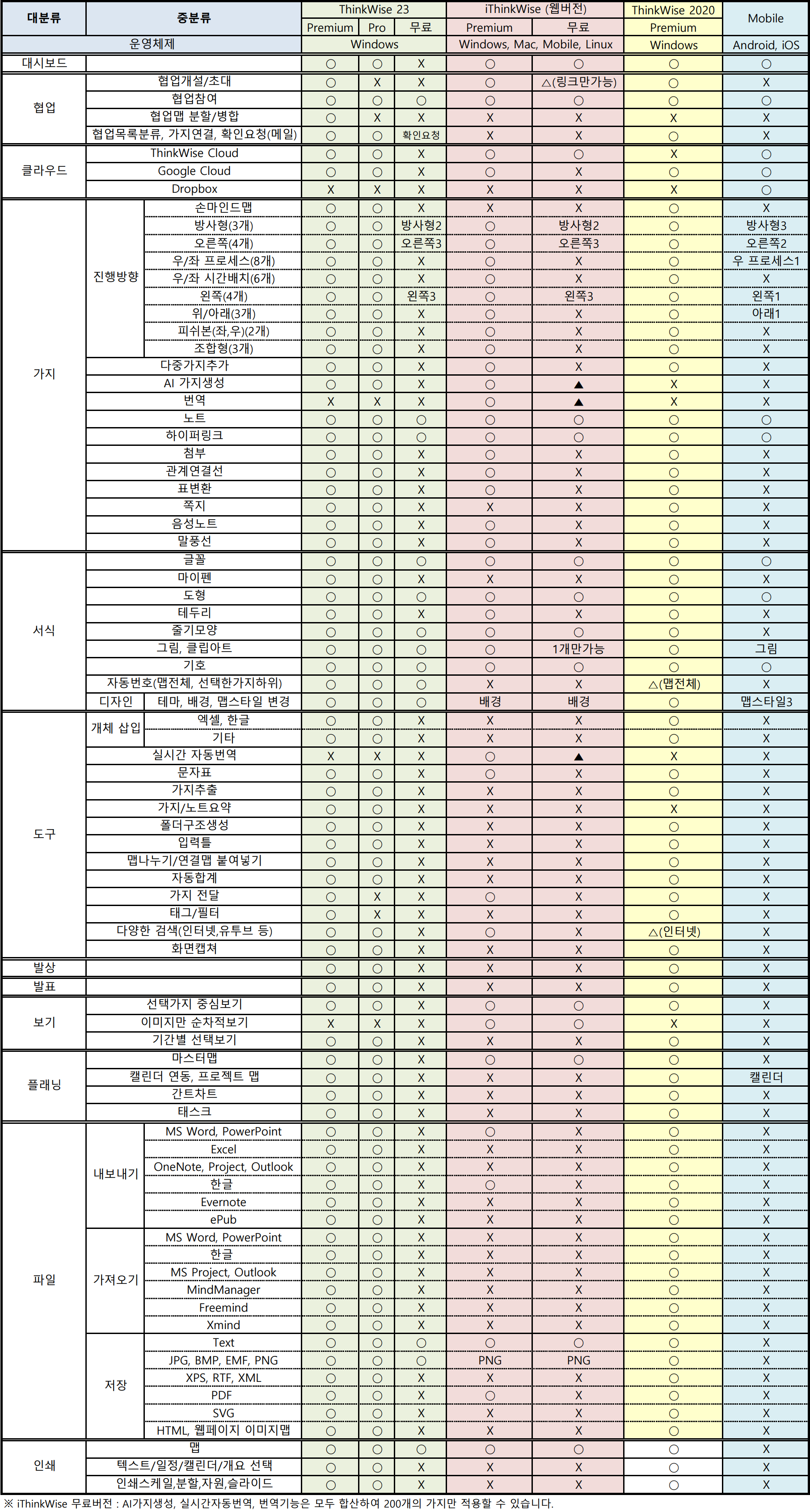 | 主要功能 | 视觉映射输入,编辑,可移动7 种的地图前进方向支撑形状,数字,符号,装饰,另存为图片文件 打印地图文件个人电脑存储,视觉和系统地组织您的思想。 | 包括所有基本功能 32 种地图前进方向支撑 自动地图设计支持 Excel表,韩文表/ 公式输入 自动搜索,屏幕截图支持 分支提取/ 映射/ 合并 甘特图,任务日历 文档转换(朝鲜语,PPT 外7 麻将) 另存为Evernote 地图和规划师集成 学习,工作效率和显着提升。