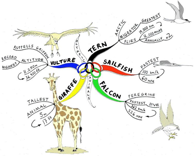 为了纪念和庆祝2012年英国奥运会,作者制作了一张旨在展示奥运会运动员非凡努力的金牌思维图。他还创建了一个潜在性的奥林匹克思维图,以探索奥林匹克主题可能激发其他领域和诞生新思想的一些方式。这张奥林匹克动物的思维图突出了动物王国中的一些世界领袖。还有很多东西要发现和探索。思维导图的参考来源是多林·金德斯利和《读者文摘》的非小说类书籍。 下面是思维导图中的动物之星:北极燕鸥 Arctic Tern ——最伟大的迁徙者;每年飞行两次19000公里(12000英里)旗鱼 Sailfish -最快的鱼;100公里/小时或60英里/小时游隼 Peregrine Falcon -潜水中速度最快的鸟;362公里/小时或226英里/小时长颈鹿 Giraffe ——最高的动物;5米或17英尺秃鹫 Ruppells Griffon ——创纪录的最高海拔;11250米或36900英尺地球上的五种特殊动物与数百种其他动物一起探索-你可能会选择什么样的奥林匹克动物?