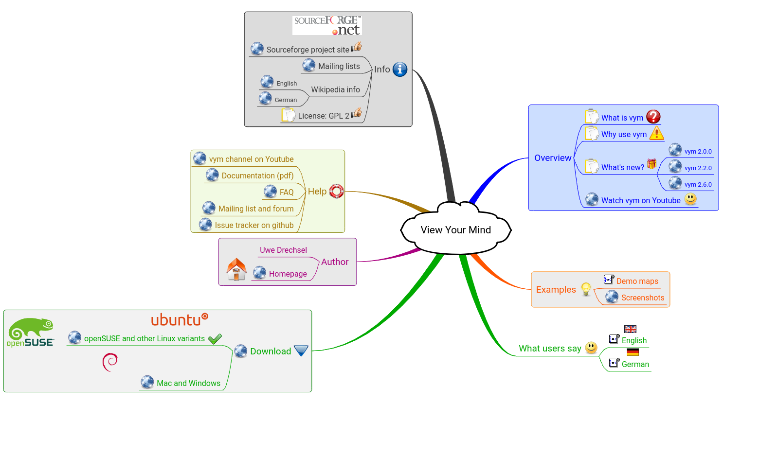 View Your Mind (开源)VYM(查看你的想法) 是一种生成和操作思维导图的工具,思维导图是思想的树状表示。此类导图可以帮助您提高创造力和效率。您可以使用它们进行时间管理、组织任务、概述复杂的上下文、对您的想法进行排序等。 导图可以在纸上或活动挂图上手绘,有助于构建您的想法。虽然本页所示的树状结构可以用手或任何绘图软件绘制,但 vym 提供了更多功能来处理此类导图。 vym 不是另一个绘图软件,而是一个以直观方式存储和修改信息的工具。例如,您可以通过按键重新排序导图的各个部分,或者通过简单的鼠标单击添加各种信息,例如完整的电子邮件。 导图可以将非常复杂的内容集中在很小的空间(例如一张纸)上。它有助于使用大脑的两面:逻辑面和创意面(例如,通过在导图中使用图片、颜色和关键字,即所谓的锚点)。它是一种组织思维方式的技巧:它可以通过发展、整理和记忆你的想法来帮助你。 因为您只使用关键字和绘图,所以它比老式笔记要快得多。你的大脑通过将事物与其他事物联系起来来记忆事物——导图利用这些联系并激发新的联系。 vym 的设计目的是使导图的更改变得非常容易:例如,如果您使用它进行时间管理,只需将任务移动到另一个地方或通过简单的鼠标单击重新着色,以便将其分配给一周中的另一天或给予这是一个新的优先事项。 相关链接: VYM 文档 PDF 位于:https://github.com/insilmaril/vym/blob/develop/doc/vym.pdf VYM 主页位于:http://www.insilmaril.de/vym/ VYM 下载页:https://sourceforge.net/projects/vym/files/latest/download PC最新2.9.27版:点这里!(24.7MB 含简体中文) 花匠评价:比较接近 Mindmapper 比较接近思维导图原意,比Xmind要好看多了,且是开源免费是,但目前版本演示模式正在开发中,还有汉化还不够全面。 |